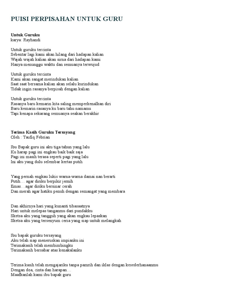 760 x 1170 · 214 kb · jpeg, puisi perpisahan smp kelas 9. Nah bagaimana kata kata perpisahan sekolah dalam bait puisi tentang perpisahan sekolah yang dipublikasikan berkas puisi, apakah berkisah seperti puisi perpisahan guru atau puisi perpisahan sedih dengan sahabat. 37 puisi guru singkat guruku tercinta pahlawan tanpa tanda jasa. Show all posts contoh puisi perpisahan contoh puisi perpisahan guru contoh puisi perpisahan kelas 6 contoh puisi perpisahan sahabat contoh puisi perpisahan sekolah contoh puisi tema perpisahan contoh puisi tentang perpisahan contoh puisi tentang perpisahan kelas 6 contoh puisi tentang. 6) pantun perpisahan guru dengan murid. Setiap ada pertemuan, pasti ada perpisahan. Inspirasi untuk menulis puisi perpisahan tentang guru, memang bisa datang dari mana saja. 10 puisi guru tersayang singkat pahlawan tanpa tanda jasa. Terutama, saat harus terpisah dari orang yang kita sayangi, apakah itu orang tua, saudara, sahabat, kekasih, teman sekolah, maupun rekan kerja. Salah satunya dengan membaca beberapa puisi yang bikin kamu terharu pada artikel ini. Biantara bahasa sunda paturay tineung kelas 6 9 12. Puisi perpisahan sekolah 3 bait, atau puisi pendek tentang perpisahan sekolah, puisi ini hanya tiga bait saja, yang bisa juga di sebut puisi singkat. Kisi kisi ujian praktek bahasa indonesia sd mi tahun 2019 emispendis.